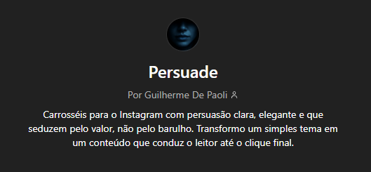 Você diz seu nicho e um assunto e recebe modelos de carrossel com texto de alta persuasão. Sem gritar. Sem parecer desesperado. Autoridade com elegância.